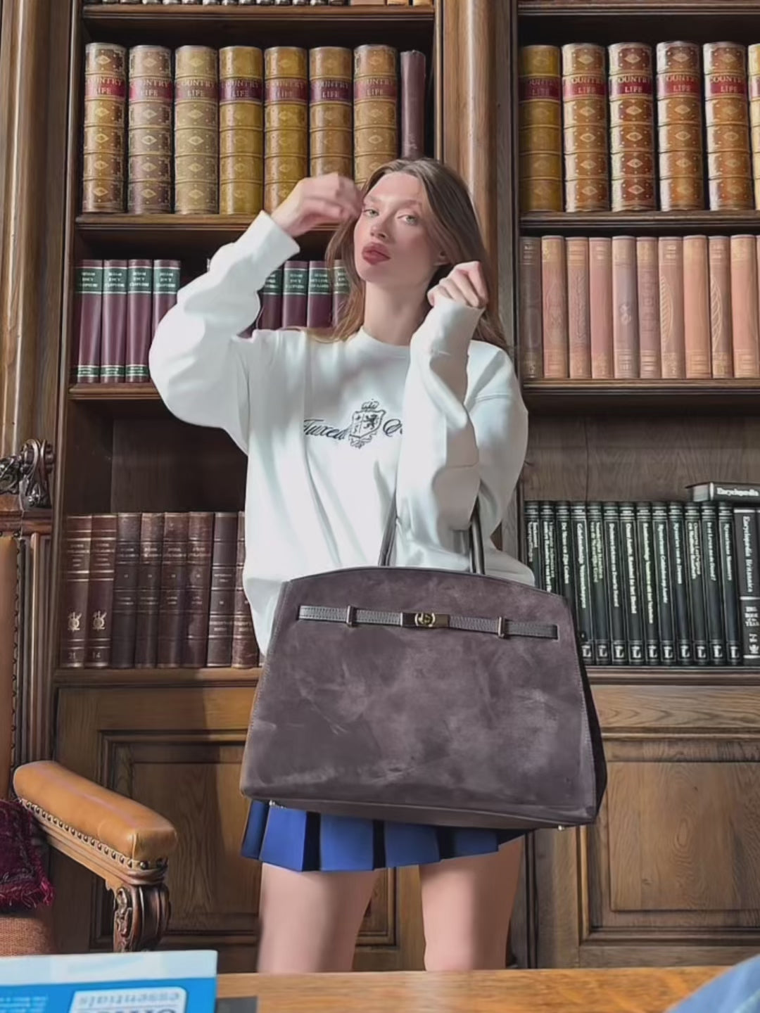 Tote bag crafted from an elegant combination of materials: soft suede on the front panel and expandable sides, fitted with snap buttons to increase capacity. Grained leather on the upper section, handles, and details adds a touch of refinement and durability. Versatile and sophisticated, it can be carried by hand, on the arm, or over the shoulder thanks to its adjustable and removable strap. The interior is spacious and functional: a main compartment with zip closure, ideal for holding A4 documents and a laptop. Cotton lining with a practical zip pocket to store valuables.